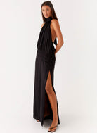 The Serena Halter Maxi Dress is made for moonlit moments and midnight escapes. Featuring a halter neckline with a thick neck tie strap and low back, this slip-on style is crafted from textured fabric that drapes beautifully over the body. Fully lined for a seamless finish, it's the ultimate statement for sunset soirées and after-dark events.